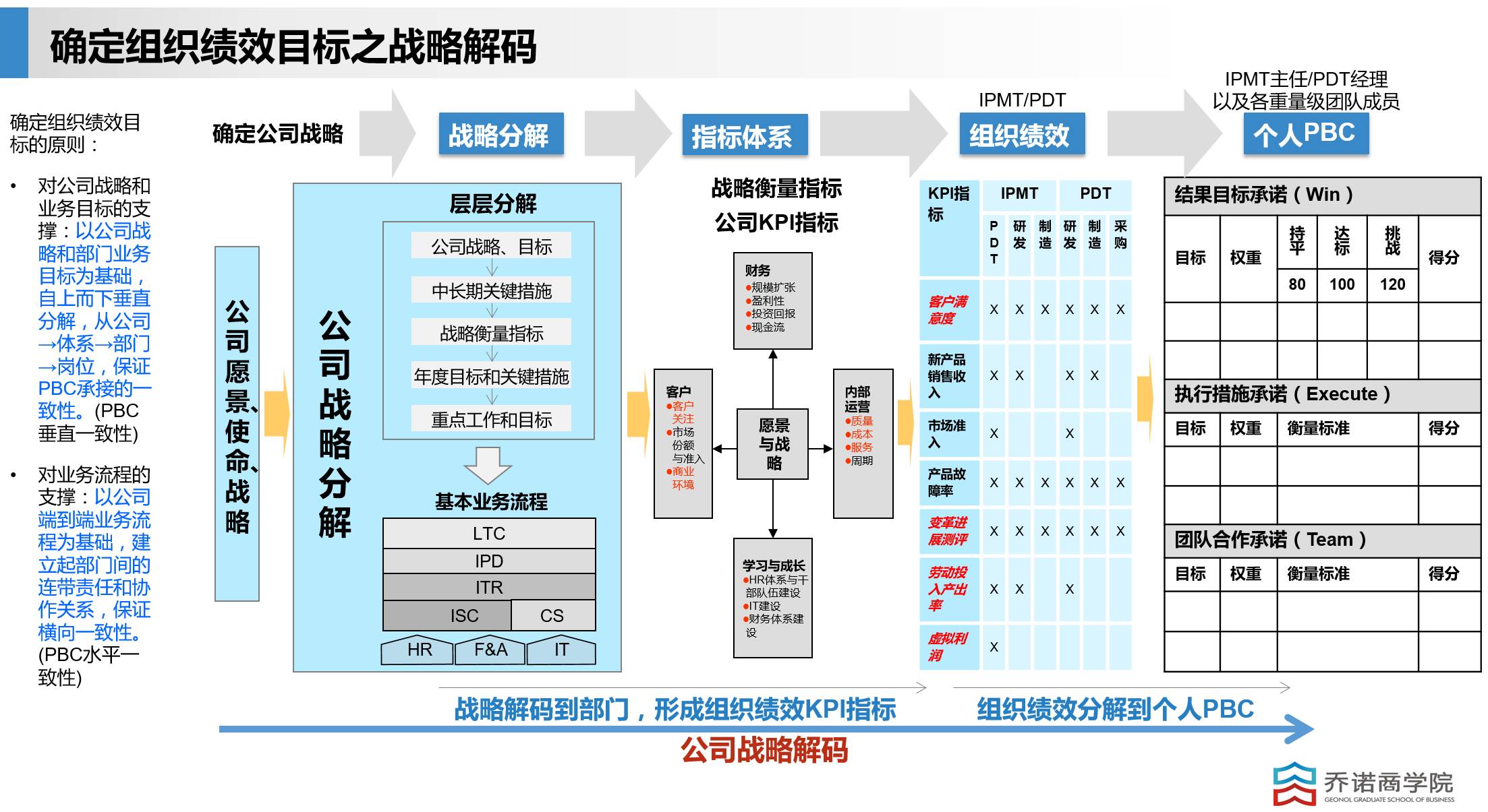 简单一点讲就是公司的战略要分解到各个部门,变成部门业务目标。自上而下的垂直分解,从公司再到体系,再到部门,再到岗位,要保证组织KPI和个人PBC从上到下是一致的,大部分公司也是这么做的。
