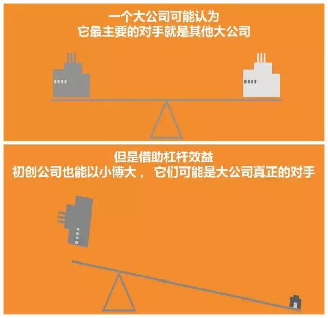 初 创企业需要善于把握机会,借势借力,与大象共舞。对于一个大公司来说,它很可能认为其最主要的对手就是其他大公司。但实则并不尽然,通过借助杠杆效益,初 创公司也能以小博大,它们可能才是大公司真正的对手。初创公司的优势非常鲜明,简称“5S优势”包括:Stealth——隐蔽、Speed——速度、 Smarts——才智、Svelteness——精简,以及Simplicity——简单。这些灵活性不容小觑,具有颠覆产业巨头的巨大潜力。
