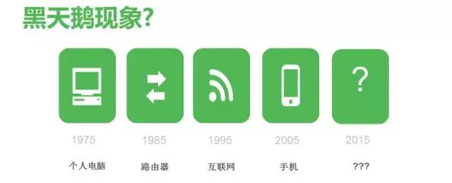 科技领域的发展呈现典型的“黑天鹅效应”,颠覆性的“黑天鹅”事件以超乎想象的冲击力改变着企业发展的大环境:自 1975年全球第一台个人电脑问世以后,几乎每10年就会出现一只巨型“黑天鹅”,为产业造成巨大冲击乃至引发洗牌:1985年诞生路由器、1995年诞 生互联网、2005年诞生智能手机,一些企业巨头随之灭亡,一些产业新兴迅速崛起。2015年的“黑天鹅”又将会是什么?